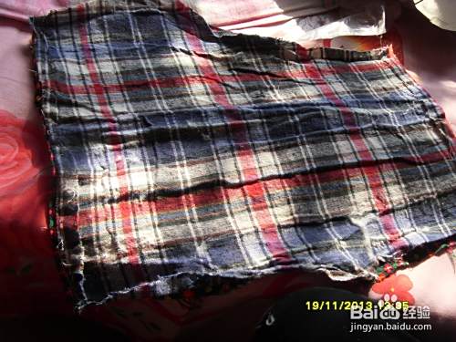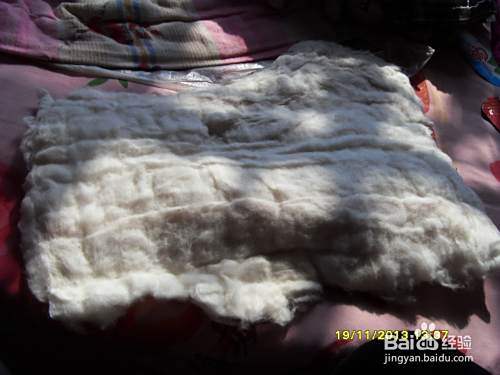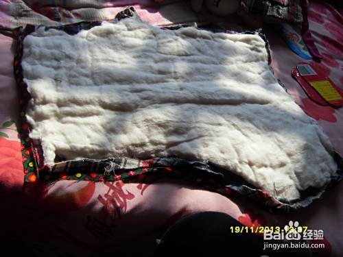 然后你打算做多厚的棉裤,也就是你想用多少棉花,把棉花铺平,并且大小与刚才剪切的布料的大小应该差不多,如图。