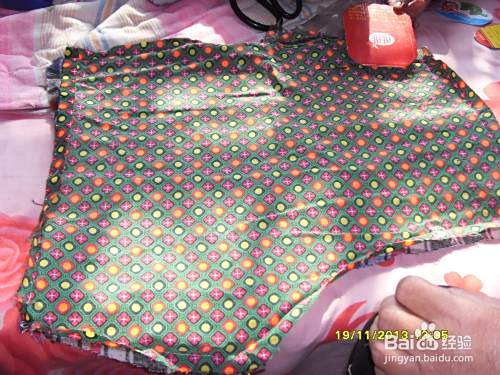 把棉裤的面料与里料缝进来,就是把第一步中的两个图的里料与面料缝起来。把棉花铺在上面然后反转,