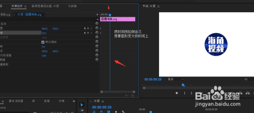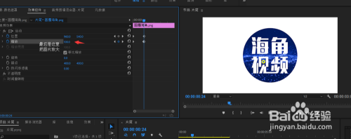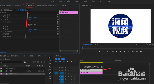 打开pr软件,把需要变大的图片或者是图形等(原理是一样的)拖到时间轴上。拖进来后,图片是很大的。我们要的效果是从小变大。