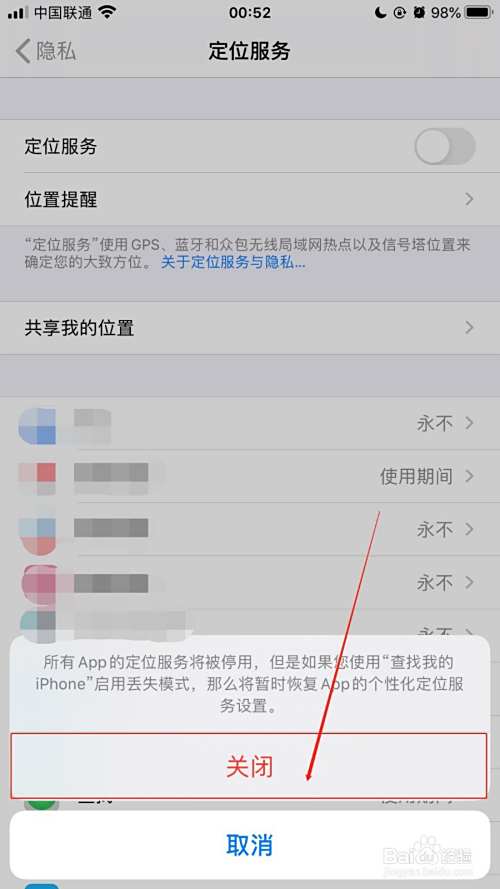 如果需要一次性设置应用访问定位位置权限为“永不”,返回“定位服务”的界面中,关掉“定位服务”的打开状态,在弹出的确认框点击“关闭”按钮即可。