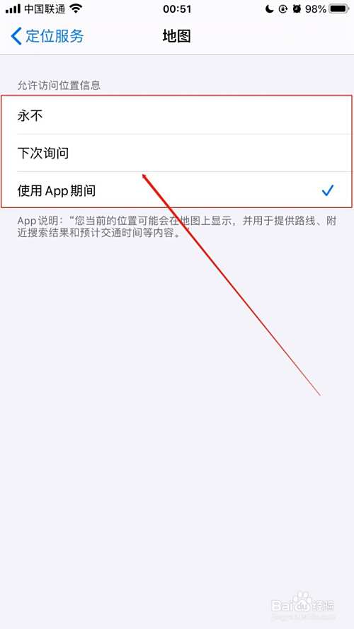 在“应用”的界面中,设置允许访问位置信息为“永不、下次询问、使用App期间”任意一项。