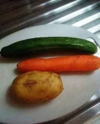 把胡萝卜和黄瓜斜切成片。土豆也切成片。