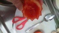 西红柿用剪刀剪出花型。用勺子挖空里面的果肉。