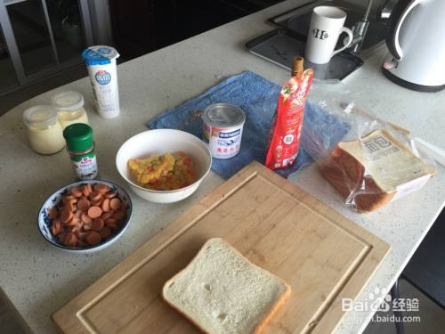 准备好原料,我用的2根火腿肠,2片小培根,切小块,一小把玉米青豆胡萝卜,就可以做4片吐司。