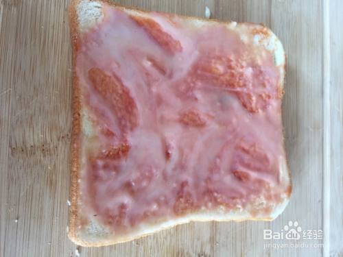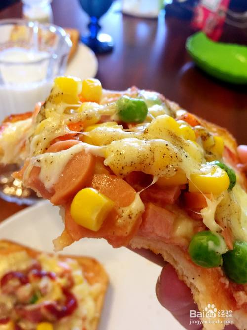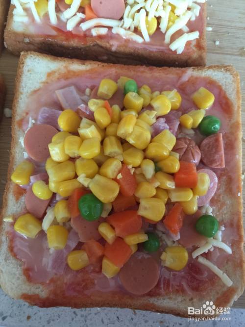 再铺上培根,火腿肠,最后放杂菜,因为颜色好看!