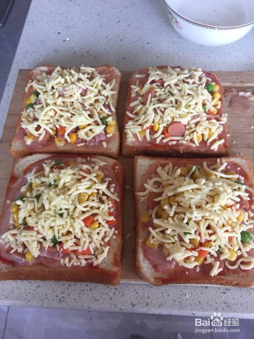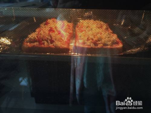预热后,黄油也融化了,将摆盘好的吐司放入。上下火,180度,8分钟。根据烤箱脾气和芝士融化程度,我会再加5分钟,上火。