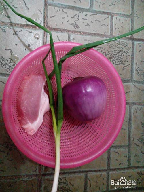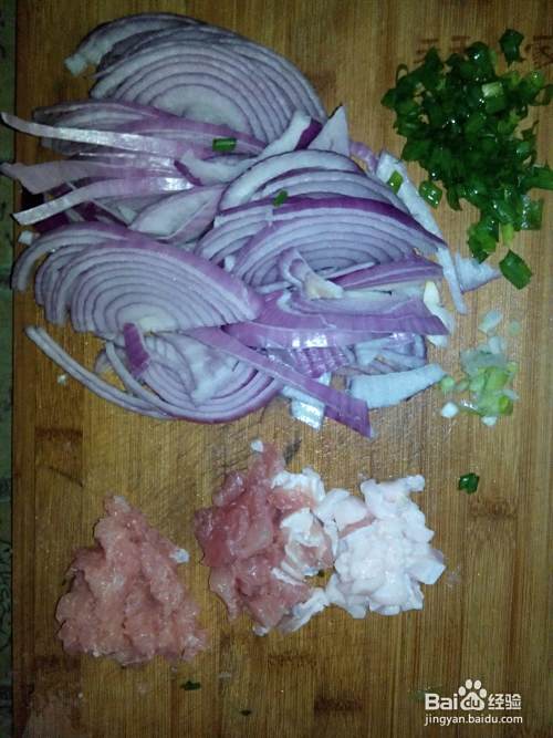 洋葱分两半切成片,肉切成丝,葱切成小段备用.