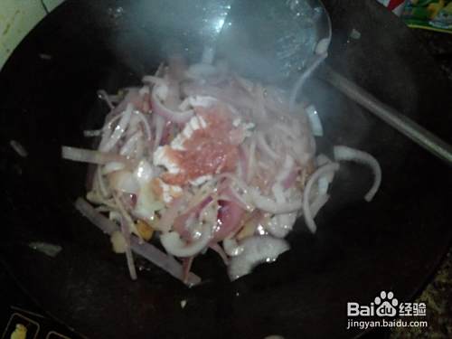 等洋葱炒到半熟时开始放入瘦肉翻炒两联案沃分钟.