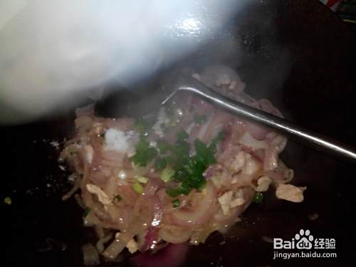 炒到八绵泪分熟时,开始放入葱,盐,鸡精翻炒均匀便可起锅了.