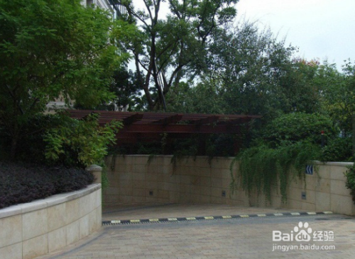 车库入口,坡道侧墙以大灌木球收头和藤本黄素馨垂挂弱化硬质贴面