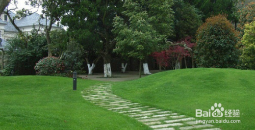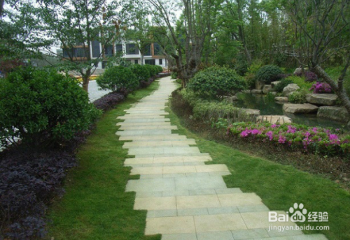 两侧草坪自然嵌入步道石板材铺装,两侧以红花继木、大叶黄杨、鸡爪槭等,自然、亲水