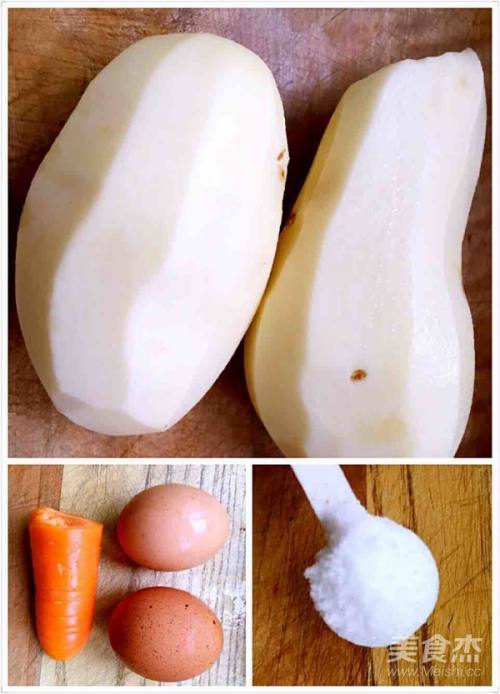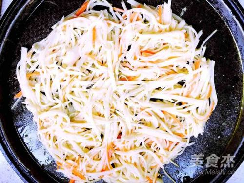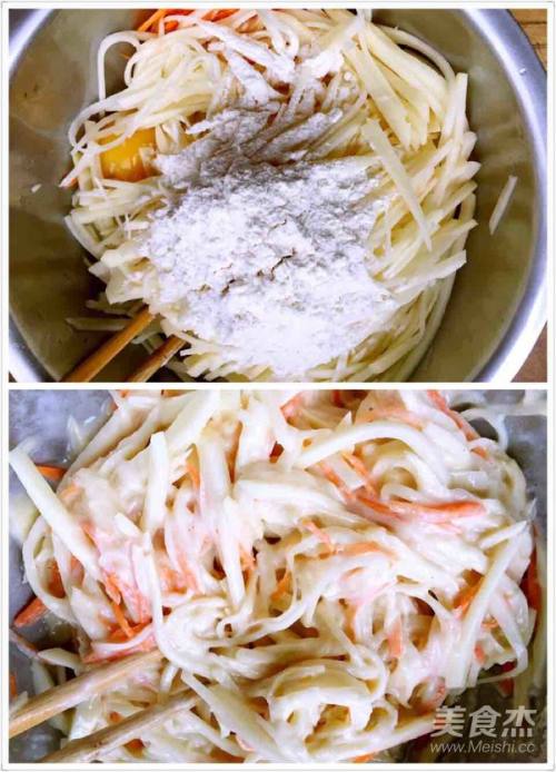 土豆 胡萝卜全部切丝 所有材料放入盆中拌匀 想吃再软点的可以适当加点水