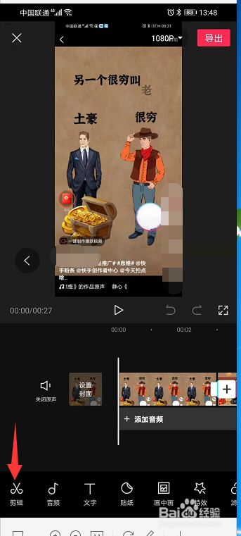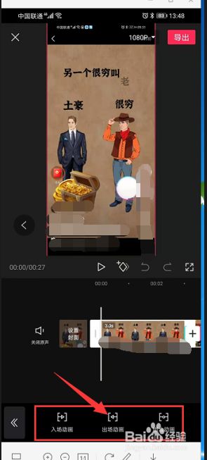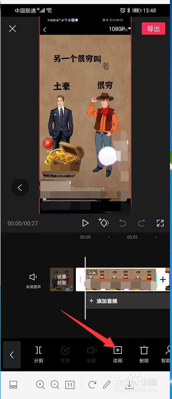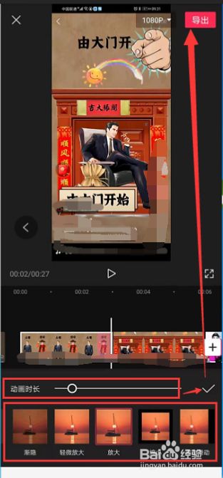 在底部菜单栏选择合适的动画效果及动画时长后点击勾的图标,再选择导出,即完成动画制作。