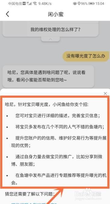 看到需要通过完善宝贝信息、提升账户的信用和在鱼塘中发布产品进行专题推荐等方式提升曝光度了