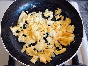 鸡蛋打散调均后在平底锅炒熟,用刀剁细装碗备用。