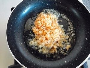 平底锅加热倒油放入姜末稍稍拌炒,然后倒入干贝、虾米、黄酒一起翻炒。
