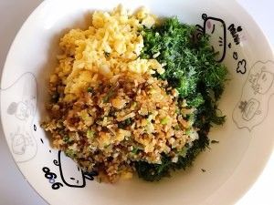 切好的茴香菜、鸡蛋碎、虾米干贝碎加盐、味精、糖、香油拌均。馅料拌好,就可以包饺子了。