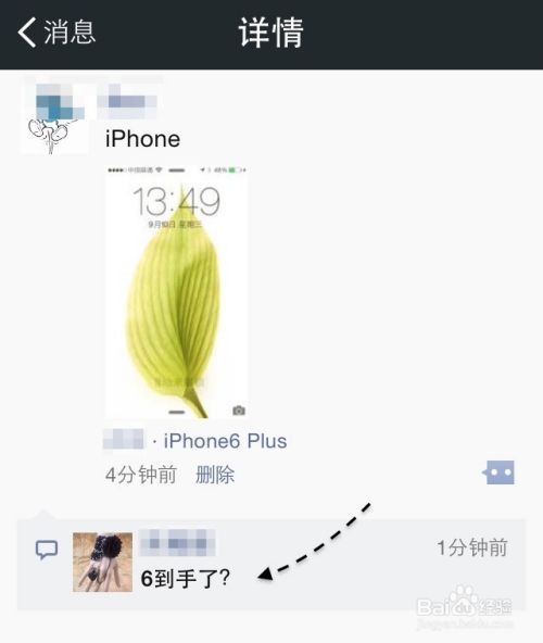 当消息发送到朋友圈之后,此时即可看到在消息下方显示一条 iPhone6 Plus 的消息,如图所示