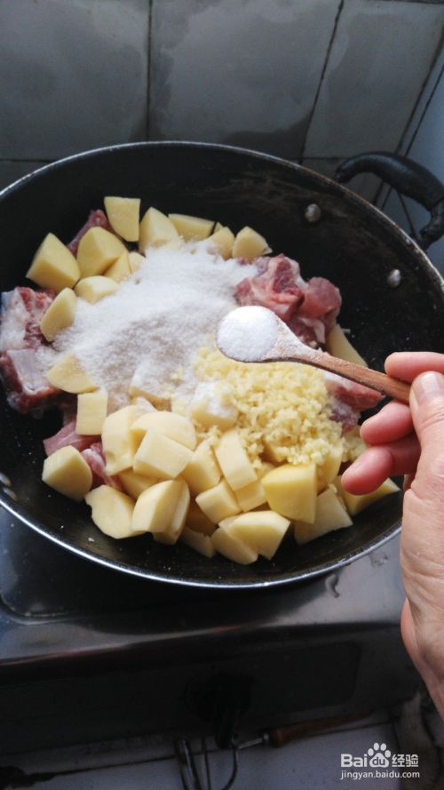 将土豆切成块,加入切好的排骨和米粉,然后加入适量食盐;