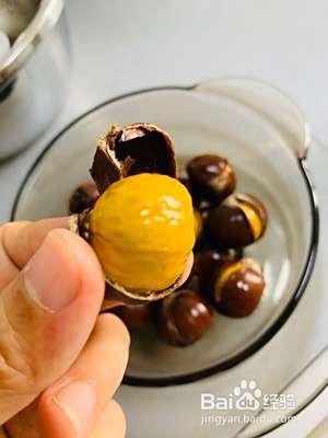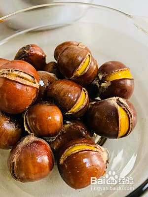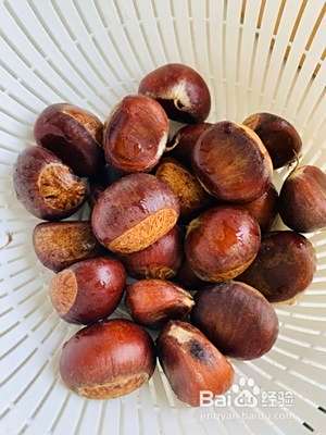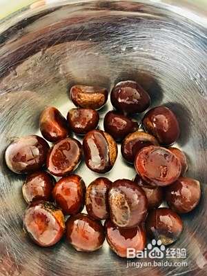 倒入盆中,倒一点食用油,让每颗板栗都裹上油
