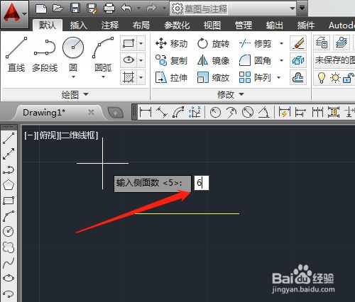 4. 系统提示输入侧面数如6,按空格键确定,指定正多边形的中心点,单击直线的端点。提示输入选项内接于圆/外切于圆,默认是内接于圆,单击选外切于圆。