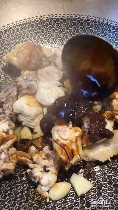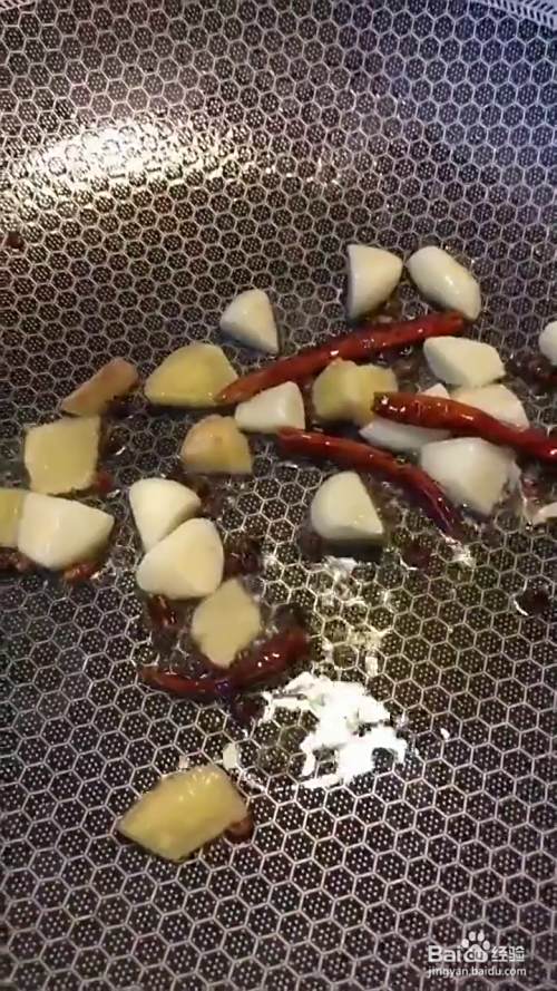 锅中油热放姜粒,蒜粒,花椒干和辣椒,炒香后加鸡块,再加上色的老抽豆瓣酱,蚝油和少许的排骨酱