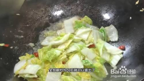 起锅烧油,油温八分热下辣椒段和蒜沫炒香,再加入白菜翻炒至完全熟透,