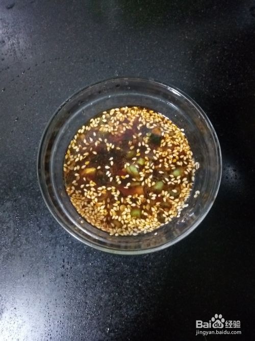 调料汁。取一小碗,加入蒜末,一勺生抽,一勺白糖,两勺子醋,香油少许。加入少许凉白开,少许熟芝麻。