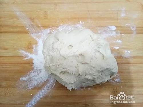 在案板上撒一层干面粉,再把面团从面盆里挖出来,放在案板上揉面。(如果这时候面团比较软,可以分次加入干面粉再次揉进面团中。)