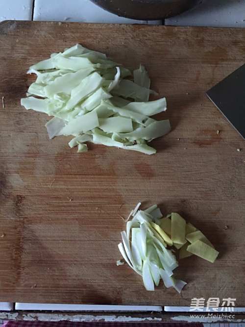 2菜花的根茎,比较粗壮的部分切薄片,口感也是不错的;葱姜切片备用。