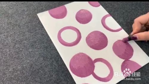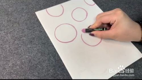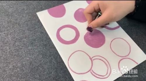 首先准备一张白纸在白纸上面,我们选择紫色的油画棒都快出一些圆形。