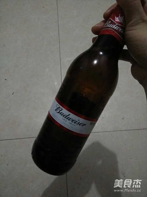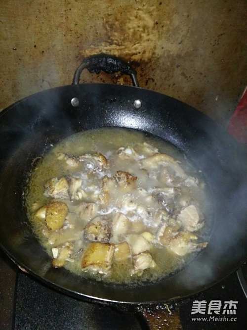 等鸡烧金黄了!把啤酒全部放入,开始煮 让啤酒自然收汁收到还盛2成汁,把辣椒放进去!放调味料。就可以出锅了!
