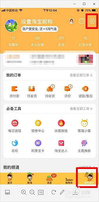 打开淘宝,点击“我的淘宝”,登录后点击“设置”。
