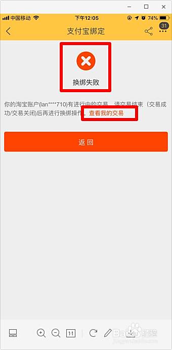 如果有交易还没有完成,就会换绑失败,如果商品都已经收到,可以查看我的交易,确认收货后就能解绑,如果开过店是不能解绑的。