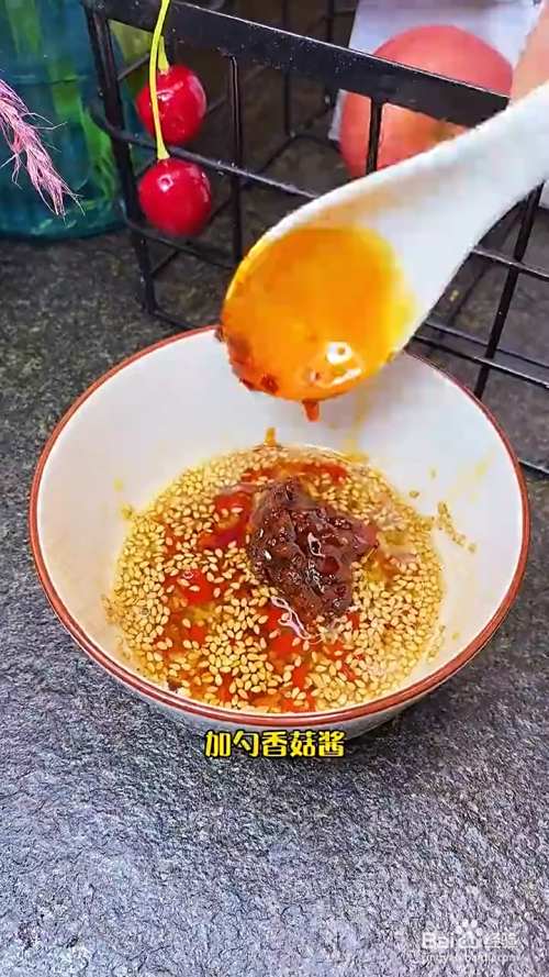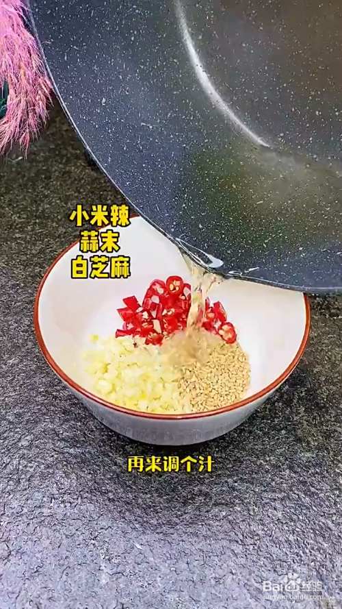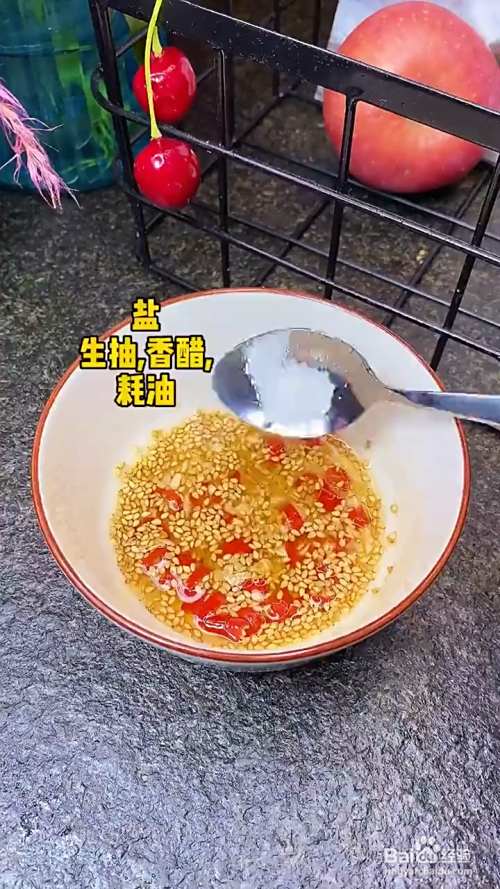 碗中加入10克小米辣,10克蒜末,10克白芝麻,起锅烧油把热油倒进去,加入暗欧板10克盐,10克生抽,10克香醋,10克蚝油,10克香菇酱搅拌