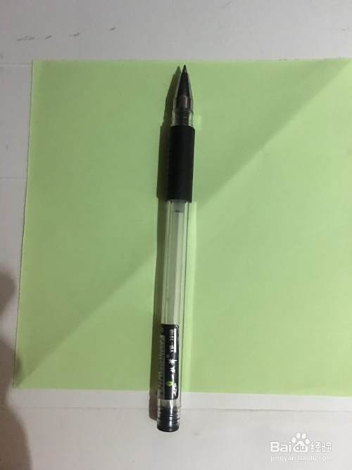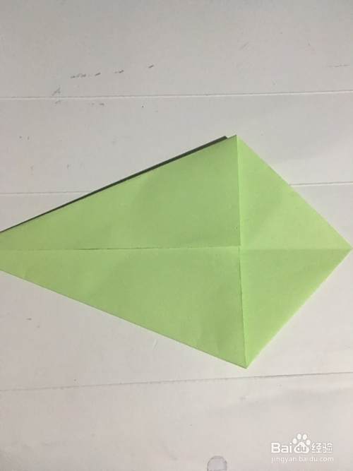 第一步 把一张粉绿色正方形彩纸 从下向上对角折后取开 再把上下两个角都向中线对折 然后上下翻过来 再次把上下两个角向里折叠至中线 顺势把底页翻过来 如图所示