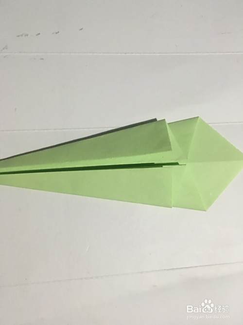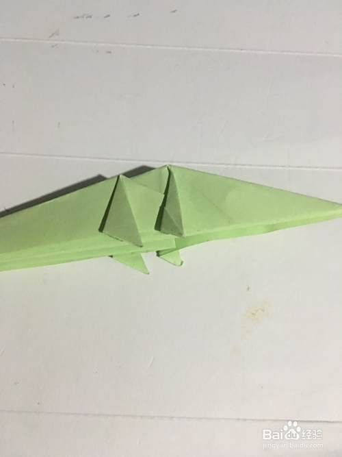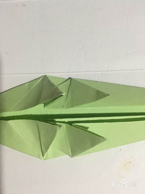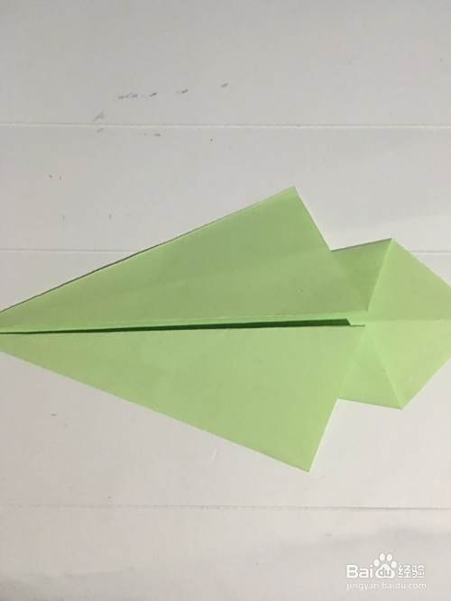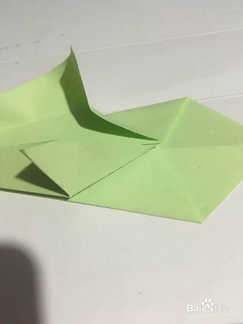 第四步 把两个小三角压倒之后 再拿起大头的上下两个角 以同样的方法步骤 折叠出两个小双三角