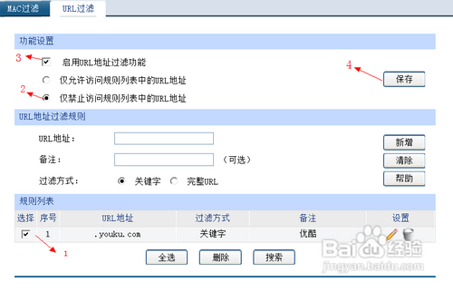 进行URL过滤设置,比如禁止访问优酷,关键字→.youku.com→新增