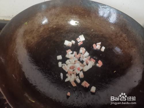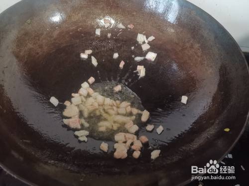 猪肉丁下入锅中炒香变色,然后加入洋葱翻炒出香味