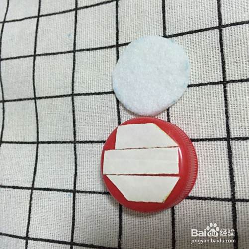 准备一般大小的瓶盖,双面胶粘无纺布,这样帽子顶更圆润立体