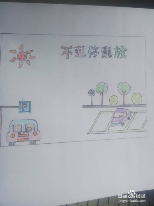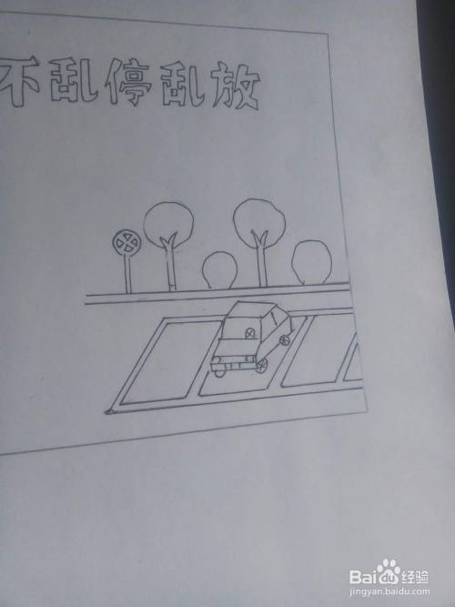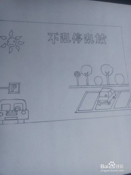 然后,在边框右下方画出马路停车场和小汽车图案;