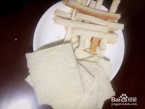 吐司五片,把吐司边切掉,然后把一片吐司批成两片,因为太厚就影响最后脆脆的口感了