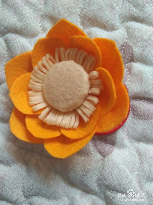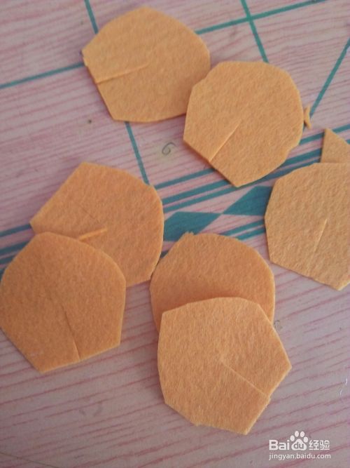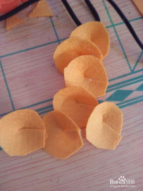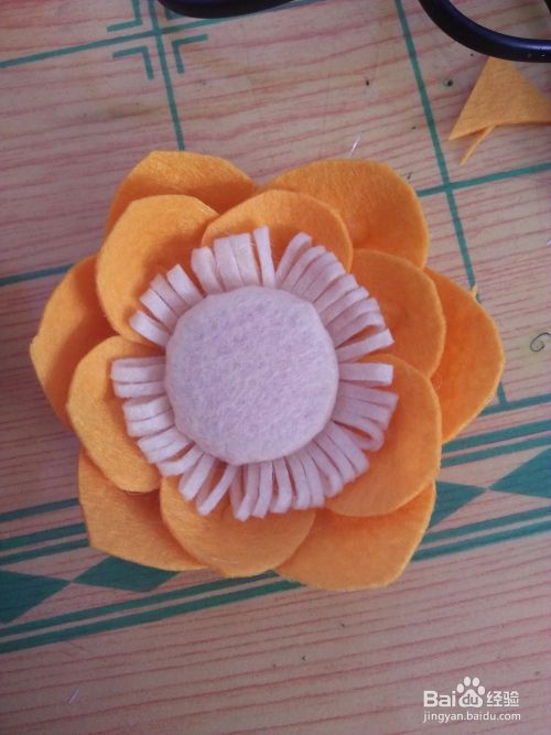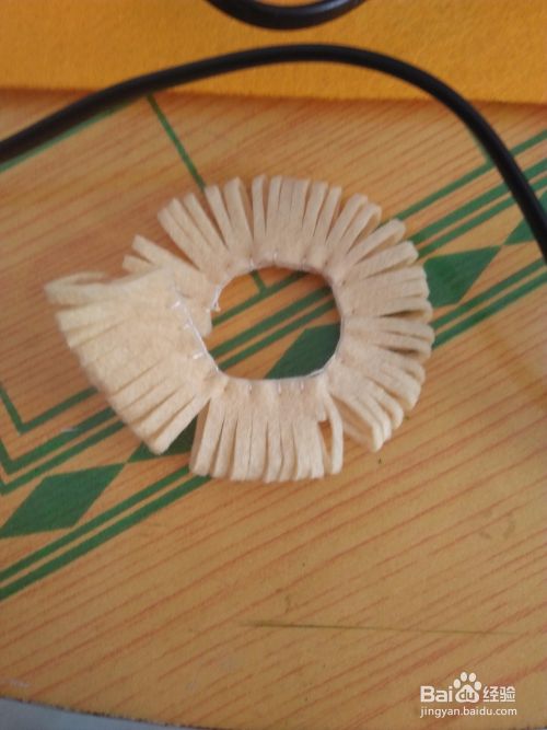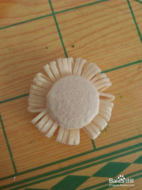 然后把剪下来的不织布,每片上我们都用剪刀剪一道豁口。我们再用胶把剪开的扣子两边的布粘在一起,如下图。然后把每个花瓣分别粘在花心的周围即可。