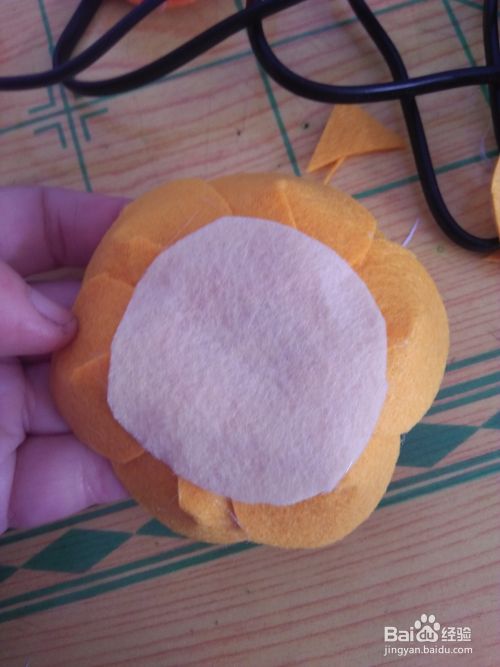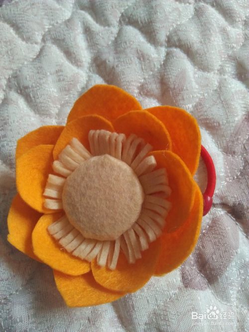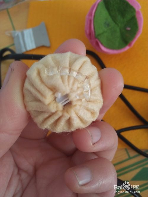 粘好后,我们翻过来。在后边,我们剪一个圆形的不织布用胶粘在后边。再剪一个小的长方形不织布,我们把头绳同样用热熔胶粘在花朵的底部就做好了。