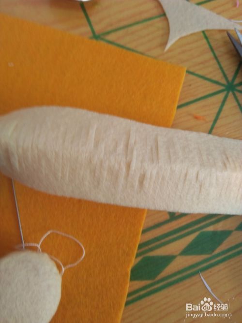 然后我们取一片长方形的不织布,把它的短边对折后,我们用剪刀在中线的位置剪成一条条的长条状,如下图。我们剪好后用针把张开的两边先缝合在一起,方便后边的操作。