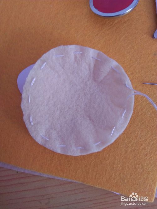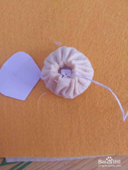 我们先开始做花心,先把白色的圆形不织布用针线把边缘缝制一圈,要缝的松一些。然后我们把扣子放进布的中间,我们把线收紧,就是下图的样子。