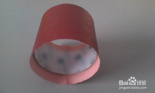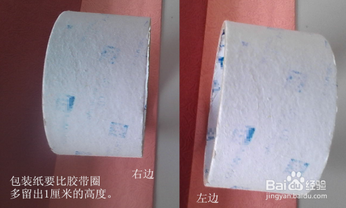 在胶带圈的里外,分别粘贴上双面胶,把双面胶的白层撕下来,将红色的包装纸对齐贴在带圈的双面胶的上面,如图所示;