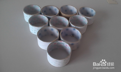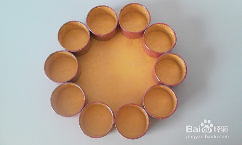 将十个胶带圈子里外全部包装好之后,摆出花瓣的形状,用透明胶带把胶圈固定好。