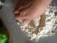 1.没有厨房秤的就用如图:3调羹面粉和一调羹猪油