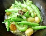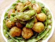 大火将豆角,土豆焖熟,最后加入味精调味,撒上蒜末。